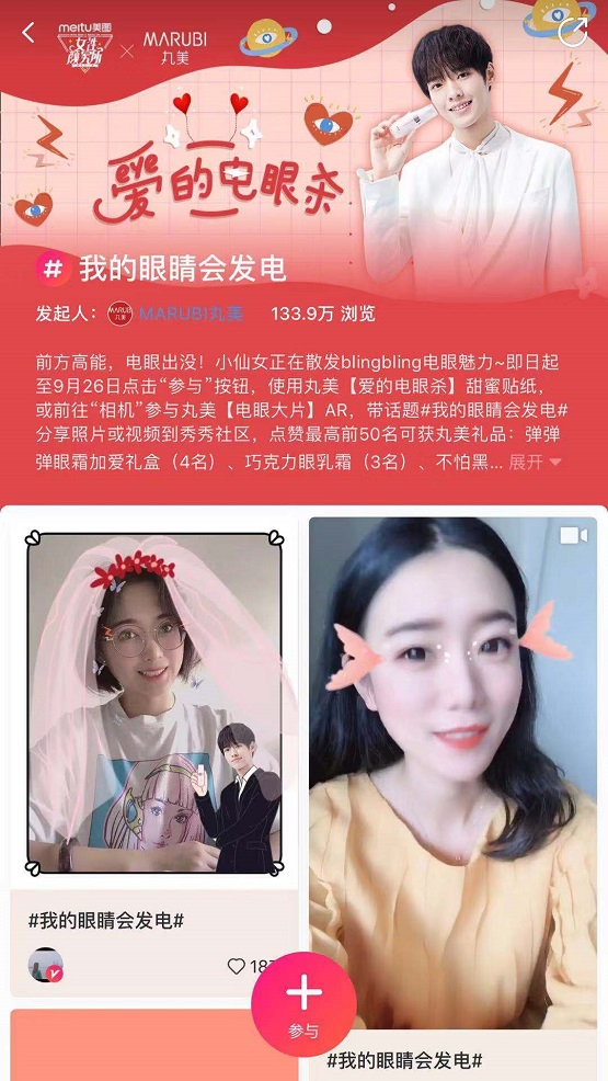 丸美和美圖線上的合作基于眼睛的洞察,在美圖平臺(tái)發(fā)起“我的眼睛會(huì)發(fā)電”話題,施展加持#愛(ài)的電眼殺#貼紙顏值,首款商業(yè)化明星貼紙,受到用戶(hù)追捧,話題瀏覽量近134萬(wàn)。以代言人彭于晏定制款#男彭友#AR特效領(lǐng)銜,另有#唯美妖精#、#電眼磁場(chǎng)#、#明眸大眼#、#神秘眼紗#等多款趣味造型AR特效供用戶(hù)隨意切換選擇,體驗(yàn)不同的電眼效果。截至發(fā)稿前,AR總曝光超8900萬(wàn),刷新美圖商業(yè)合作AR最高值,硬廣總曝光超2.7億。