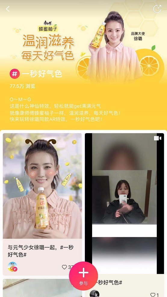 針對(duì)康師傅蜂蜜柚子的產(chǎn)品功能與特色,美圖為其打造的互動(dòng)內(nèi)容帶著明顯的秋季滋養(yǎng)色調(diào),在平臺(tái)發(fā)起“一秒好氣色”話題,并基于自身黑科技實(shí)力,以品牌大使徐璐的AR效果圖為素材,用明星力量號(hào)召用戶(hù)們參與活動(dòng),獲得77.5萬(wàn)瀏覽,玩轉(zhuǎn)代言人同款A(yù)R特效。