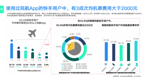 同樣,快手用戶也愛(ài)出行、愛(ài)“遠(yuǎn)方”。通過(guò)一年內(nèi)使用過(guò)民航App的快手用戶發(fā)現(xiàn),高頻民航(4次以上/年)快手用戶占比43.8%,超3成的單次機(jī)票費(fèi)用高于2000元。在民航服務(wù)方面,空乘服務(wù)、空中wifi以及飛機(jī)餐食是需求的重點(diǎn)領(lǐng)域,說(shuō)明快手用戶同樣注重出行的品質(zhì)。