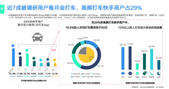 在網(wǎng)服行業(yè)“行”的領(lǐng)域,一線、新一線城市表現(xiàn)出職住分離的現(xiàn)象。從城市居民出行目的地分布看,工作商務(wù)和休閑娛樂(lè)成為出行的主要目的,分別占比39%和31%。同時(shí),快手用戶表現(xiàn)出不僅依賴打車出行,也注重環(huán)保低碳出行。