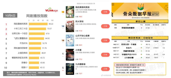 依托于自身優(yōu)質(zhì)的內(nèi)容和首創(chuàng)的“環(huán)?!痹掝}引入,單憑國(guó)內(nèi)首部環(huán)保題材的青春劇這一噱頭就已賺足了觀眾目光。根據(jù)多家媒體數(shù)據(jù)顯示,《我的莫格利男孩》播出期間多日占據(jù)微博電視劇榜、Vlinkage網(wǎng)絡(luò)劇榜、骨朵熱度指數(shù)排行榜等評(píng)分榜榜首,成績(jī)不俗。