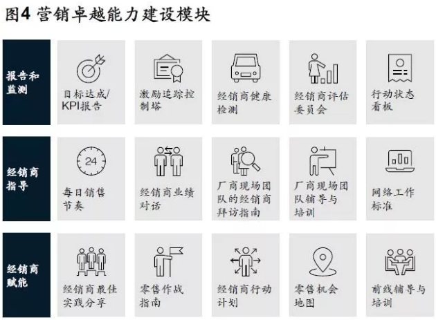 車企還應(yīng)該為經(jīng)銷商提供一系列標(biāo)準(zhǔn)工具、模板和最佳實(shí)踐參考,以幫助他們快速提升零售能力。圖4列出了多項(xiàng)營(yíng)銷能力建設(shè)模塊。