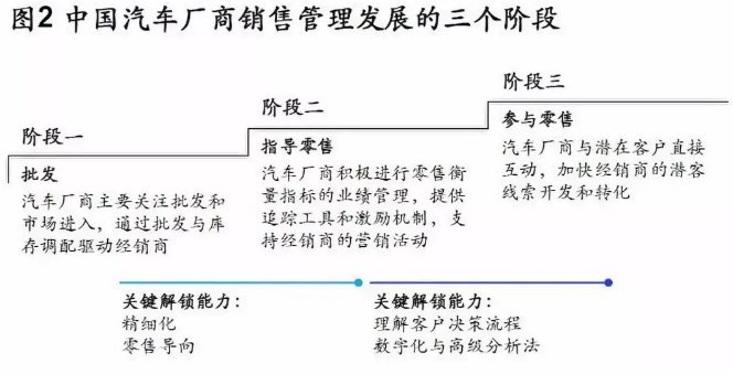 車企與終端消費(fèi)者的關(guān)系有了根本突破,切入消費(fèi)者的購(gòu)買決策歷程,開始與經(jīng)銷商緊密合作,包括開發(fā)線索、處理線索和向經(jīng)銷商移交線索,以及售后服務(wù)。