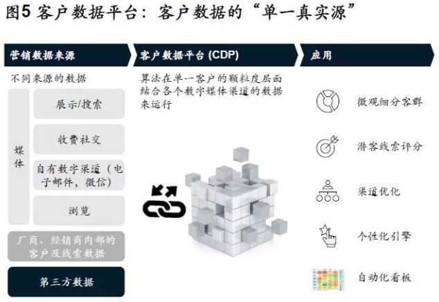 在重新思考組織與能力建設(shè)的同時(shí),車企也需要考慮如何搭建新時(shí)期的技術(shù)平臺(tái)。盡管在過去幾年林林總總出現(xiàn)了很多解決方案,我們認(rèn)為大部分在實(shí)際提升效率,改善經(jīng)營(yíng)等方面的效果都有待驗(yàn)證。當(dāng)車企逐漸過渡到第三階段深度參與零售時(shí),眾多技術(shù)平臺(tái)中比較基礎(chǔ)的將是客戶數(shù)據(jù)平臺(tái)(CDP),該平臺(tái)將單個(gè)客戶數(shù)據(jù)聚合集中到中心數(shù)據(jù)庫(kù)。CDP確保汽車廠商不僅可收集數(shù)據(jù),還可將數(shù)據(jù)結(jié)構(gòu)化以便推動(dòng)銷售和營(yíng)銷活動(dòng)。圖5列出了CDP的主要組件。我們認(rèn)為車企既要擁抱技術(shù)平臺(tái),又要避免為了“看起來先進(jìn)”而引入數(shù)據(jù)和技術(shù),如何取得平衡也是制勝的關(guān)鍵所在。