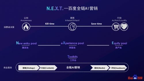 N.E.X.T. 百度全鏈AI營(yíng)銷,重新定義了百度在消費(fèi)者運(yùn)營(yíng)下的營(yíng)銷新路徑,即AI和大數(shù)據(jù)技術(shù)在消費(fèi)者需求激發(fā)池、品牌資產(chǎn)池、營(yíng)銷體驗(yàn)池三大營(yíng)銷環(huán)節(jié)的全面打通,利用商業(yè)工具組合(Toolkits)為客戶和合作伙伴賦能每一個(gè)鏈路,打通消費(fèi)者營(yíng)銷決策閉環(huán),實(shí)現(xiàn)共振式的協(xié)同營(yíng)銷能力,用商一體全面滿足品牌營(yíng)銷的各項(xiàng)訴求。