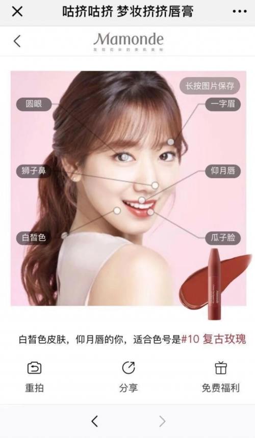 在夢(mèng)妝“AI擠上唇”的案例中,通過運(yùn)用百度AI人臉識(shí)別技術(shù),首次實(shí)現(xiàn)在線試色,并創(chuàng)新推出AI智能色號(hào)推薦功能,讓消費(fèi)者切身感受到AI技術(shù)帶來的便利。