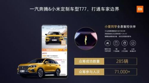基于小米科技公司的屬性,小米營銷一直嘗試通過技術(shù)賦能產(chǎn)品新的賣點(diǎn)。例如一汽奔騰&小米定制車型T77。在車中植入小愛同學(xué)全息智控伙伴,不僅連接了車和家兩個(gè)場(chǎng)景,更賦予產(chǎn)品新的賣點(diǎn)以及售賣體驗(yàn)。通過小米有品的眾籌方式,參與階段留咨達(dá)到71000人次,成功眾籌285輛車。
