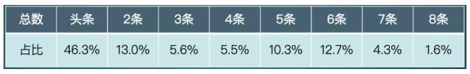 投放總次數(shù)16000+,其中頭條占比46.3%,除此之外分布在2-8條,仔細(xì)看會發(fā)現(xiàn),其中的2、5、6條的占比相對來說是較高的,3-4條、7-8條相對效果較弱。