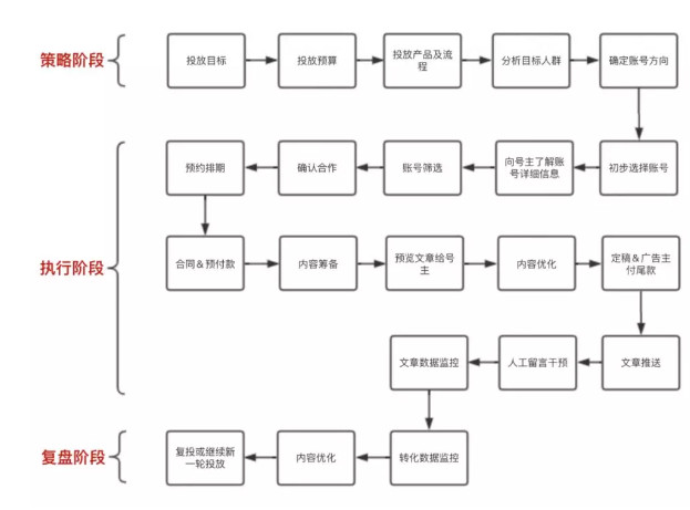 整個流程里,像策略階段每個企業(yè)需求、產(chǎn)品、用戶都不同,只要根據(jù)企業(yè)需求和對自己產(chǎn)品、用戶的理解,就可以確定投放方向,這部分就不多做闡述了。我會重點梳理執(zhí)行階段里的賬號篩選、內(nèi)容籌備、人工留言,和復(fù)盤階段,這幾個相對來說比較重要且容易踩坑的點。