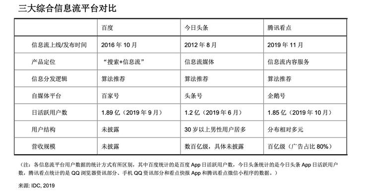 根據(jù)其11月官方發(fā)布的信息顯示,騰訊看點每日內(nèi)容消費量超過82.5億,平臺用戶覆蓋了全國各線城市的各個年齡段。騰訊看點的不斷創(chuàng)新突破與升級使其進入了中國互聯(lián)網(wǎng)信息流市場的「第一梯隊」,與百度和今日頭條形成了「三足鼎立」的局面。