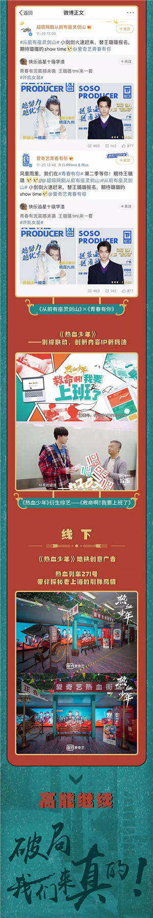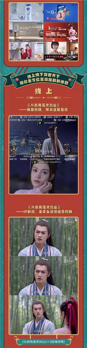 除了花樣廣告營(yíng)銷(xiāo)產(chǎn)品之外,愛(ài)奇藝還推出線(xiàn)上線(xiàn)下全方位創(chuàng)新?tīng)I(yíng)銷(xiāo)玩法,通過(guò)線(xiàn)上彈幕玩梗、IP聯(lián)動(dòng)、打造衍生綜藝,以及線(xiàn)下場(chǎng)景營(yíng)銷(xiāo),為受眾帶來(lái)全方位互動(dòng)觀劇體驗(yàn),提升觀眾的粘度與劇集聲量,從而為品牌高效賦能。