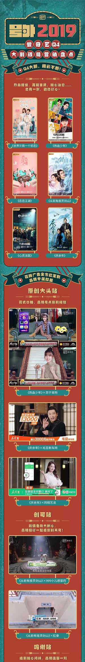 對(duì)于品牌來(lái)說(shuō),受眾的注意力在哪兒,營(yíng)銷(xiāo)的戰(zhàn)場(chǎng)就在哪兒。借助熱點(diǎn)內(nèi)容營(yíng)銷(xiāo)早已是品牌們的共識(shí),而觀眾基礎(chǔ)深厚的愛(ài)奇藝大劇IP更成為品牌熱衷的營(yíng)銷(xiāo)陣地。愛(ài)奇藝2019迎來(lái)收官之際,火爆的不止是《世界欠我一個(gè)初戀》、《熱血少年》、《戀戀江湖》、《從前有座靈劍山》、《慶余年》、《心靈法醫(yī)》等多元化題材的大劇,還有眾多品牌借助這些大劇IP在創(chuàng)意營(yíng)銷(xiāo)玩法上的有益嘗試。