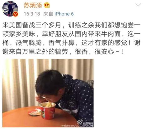 ▲蘇炳添在社交媒體曬出國外比賽吃泡面場景