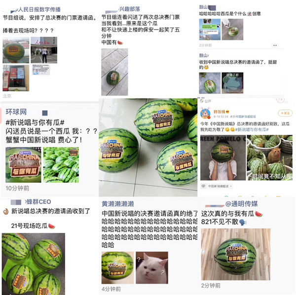 愛奇藝在《中國新說唱2019》總決賽錄制周,策劃了“新說唱與你有瓜”系列跨界營銷事件,跨界聯(lián)動(dòng)“閃送”送出創(chuàng)意“西瓜邀請函”,在微博、朋友圈等引發(fā)病毒式刷屏傳播。而后,又通過策劃“HOMIE的力量邀請粉絲吃瓜”粉絲見面會(huì),聯(lián)動(dòng)17位人氣Rapper與粉絲進(jìn)行互動(dòng),成功攪動(dòng)粉絲圈層引發(fā)自主傳播,充分為總決賽預(yù)熱。