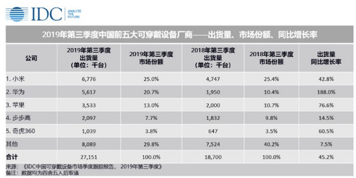 去年6月,小米手環(huán)4開售僅8天,全球出貨量就已經(jīng)達到100萬臺。而在去年Q3,IDC發(fā)布《中國可穿戴設(shè)備市場季度跟蹤報告,2019年第三季度》中顯示,小米可穿戴設(shè)備出貨量高居第一。