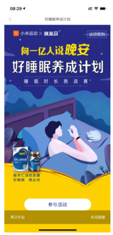 其次,在剛剛過去的12月,進一步打造“深度睡眠挑戰(zhàn)賽”“優(yōu)質(zhì)睡眠挑戰(zhàn)賽”。參加的用戶可以直接生成睡眠報告,查看自己的睡眠數(shù)據(jù)、分析及“晚必安好睡眠攻略”。值得注意的是,活動頁面了解健康睡眠知識,并簽到打卡,將有機會獲得小米Amazfit GTR手表、小米體重秤、小米手環(huán)4,每一位參與者都可以領(lǐng)取有助于睡眠的晚必安·酸棗仁油軟膠囊體驗裝。