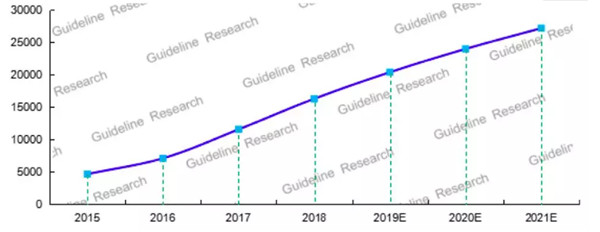 2015-2021年中國OTT TV機頂盒保有量(累計出貨量)發(fā)展預(yù)測示意圖(來源:格蘭研究)
