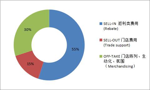 數(shù)據(jù): Sell-in 絕大多數(shù)采用返利類費(fèi)用(Rebate)包含合同內(nèi)年返、季返、月返、階段沖量占約55%,Sell-out 門店費(fèi)用類 (Trade support) 包含門店進(jìn)貨激勵(lì)、鋪市活動(dòng)支持等占約15%,Off-take 品牌形象商品陳列類(Merchandising)包含主貨架/二次陳列、生動(dòng)化、氛圍占約30%。