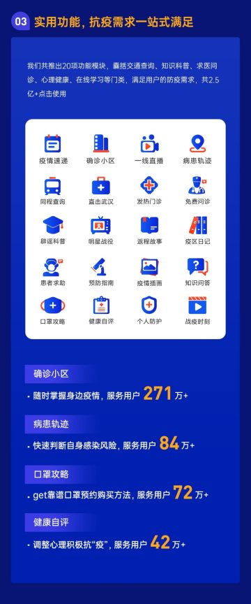 在功能服務(wù)方面,「同呼吸,共戰(zhàn)“疫”」專欄不斷更新多項實用功能,上線了“確診小區(qū)”、“病患軌跡”、“口罩攻略”、“健康自評”、“免費問診”、“明星戰(zhàn)疫”、“個人防護”等共計20項功能模塊,讓用戶的防疫需求得到一站式滿足。