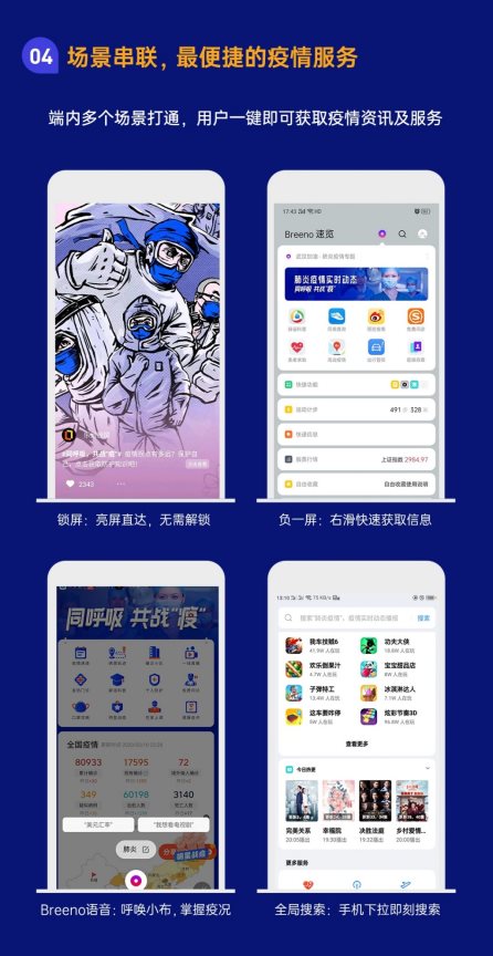 此外,各大內(nèi)容入口場景均策劃上線了多項定制專題,充分發(fā)揮渠道優(yōu)勢,通過創(chuàng)新的內(nèi)容及形式做好防疫內(nèi)容的宣傳工作。例如,樂劃鎖屏亮屏直達,無需解鎖即可查閱疫情實況信息;負一屏通過右劃即刻掌握疫情信息,更有「密切接觸者測量儀」免安裝即可快速查看自己是否接觸過傳染源;Breeno語音則結(jié)合自身AI技術(shù),實現(xiàn)呼喚小布及時掌握疫況,同時攜手王凱、Angelababy、范丞丞、陳赫、佟大為、李晨、海清、王子文、周筆暢、劉蕓、喬欣等明星,為用戶送上疫情防控小貼士。