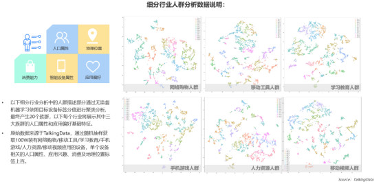 除了六大行業(yè)市場(chǎng)分析,此次報(bào)告重點(diǎn)采用無監(jiān)督機(jī)器學(xué)習(xí)的方法對(duì)以上六大行業(yè)用戶進(jìn)行研究。我們從每個(gè)行業(yè)中分別抽取100W隨機(jī)樣本設(shè)備,根據(jù)單個(gè)設(shè)備所具有的人口屬性、地理位置、消費(fèi)能力、移動(dòng)設(shè)備屬性、移動(dòng)應(yīng)用偏好的標(biāo)簽分值進(jìn)行人群聚類,最終將每個(gè)行業(yè)人群劃分為20類族群,并對(duì)特征顯著的各行業(yè)高價(jià)值人群進(jìn)行分析和展示。