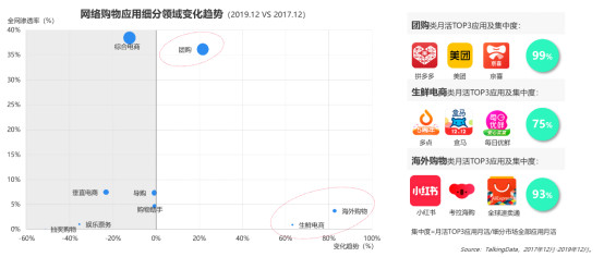 從網(wǎng)絡(luò)購物應(yīng)用細(xì)分領(lǐng)域來看,目前市場(chǎng)已經(jīng)相對(duì)成熟的團(tuán)購應(yīng)用,近兩年在拼多多、京喜等瞄準(zhǔn)下沉市場(chǎng)且快速成長(zhǎng)的團(tuán)購應(yīng)用拉動(dòng)下,仍然保持增長(zhǎng),但目前團(tuán)購應(yīng)用的流量集中度非常高,頭部市場(chǎng)格局相對(duì)穩(wěn)定。
