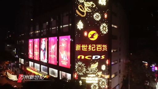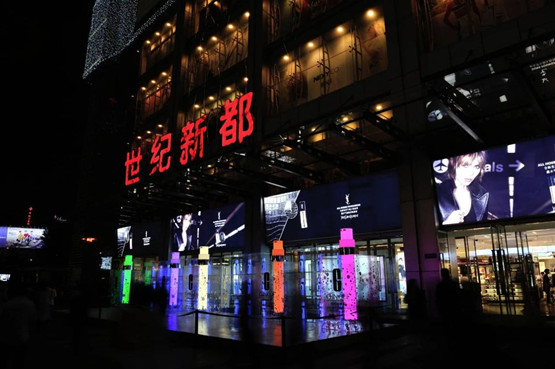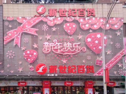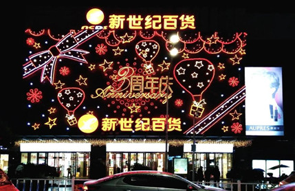 在夜空彩虹的配合下,一幅周年慶燈飾畫呈現(xiàn)在眾人眼前。設(shè)計團(tuán)隊大量使用了禮品元素,喻示著新世紀(jì)百貨對消費者這三年來支持的一種感謝與回饋。