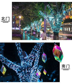 樹上的鐳射鉆石花朵,在日光和夜間燈光的照耀下,折射出點(diǎn)點(diǎn)星光,光影輕輕掠過行人的臉龐,柔美斑駁。此時(shí),你會(huì)看到光之蜻蜓在樹上輕快掠過,仿佛進(jìn)入了花影迷離的夢境。