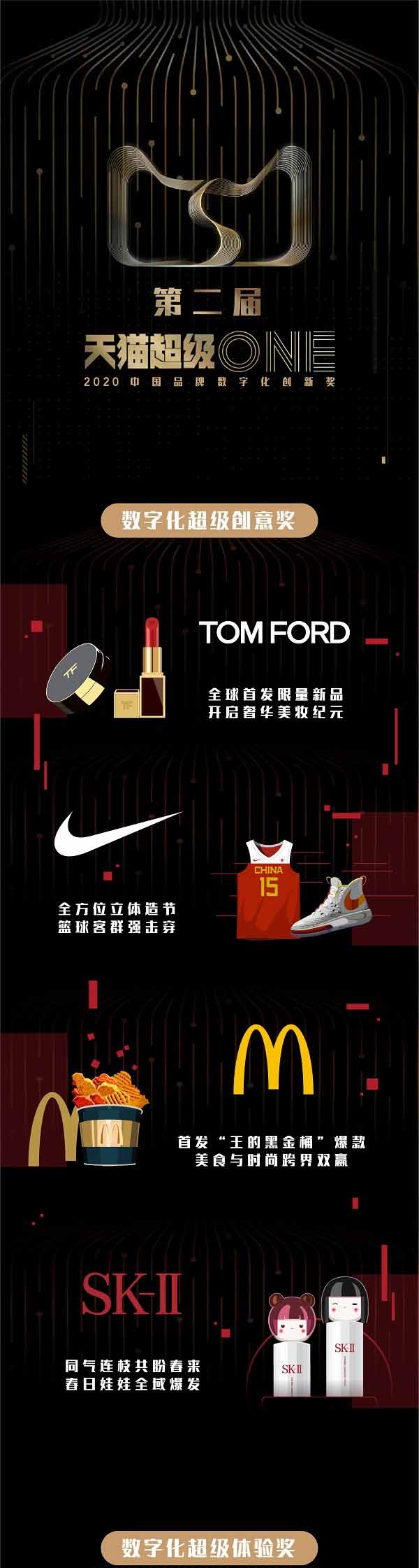 與此同時(shí),最受關(guān)注的數(shù)字化領(lǐng)域標(biāo)桿獎(jiǎng)項(xiàng)、權(quán)威獎(jiǎng)項(xiàng)“天貓超級(jí)ONE ——2020中國(guó)品牌數(shù)字化創(chuàng)新獎(jiǎng)”也正式對(duì)外揭曉。 天貓超級(jí)ONE是數(shù)字化營(yíng)銷沉淀方法論的獎(jiǎng)項(xiàng),基于天貓超級(jí)品牌日過(guò)往一年眾多營(yíng)銷活動(dòng)與案例的總結(jié),評(píng)選出優(yōu)秀品牌的案例將成為新一年數(shù)字化營(yíng)銷的風(fēng)向標(biāo),為品牌營(yíng)銷所帶來(lái)的創(chuàng)新勢(shì)能。自去年創(chuàng)立以來(lái),天貓超級(jí)ONE已經(jīng)成為 TOP TALK天貓超級(jí)品牌私享會(huì)乃至整個(gè)營(yíng)銷行業(yè)備受期待的權(quán)威獎(jiǎng)項(xiàng)。 今年,天貓超級(jí)ONE的評(píng)選過(guò)程也更加慎重和權(quán)威,此次天貓超級(jí)ONE基于過(guò)往一年中參與天貓超級(jí)品牌日的品牌,逾100個(gè)品牌案例積極報(bào)名參與。在天貓超級(jí)品牌日生態(tài)鏈的全員參與內(nèi)部評(píng)審的同時(shí),權(quán)威財(cái)經(jīng)媒體人、廣告營(yíng)銷意見領(lǐng)袖也首次助陣,搭建起更為專業(yè)的評(píng)審團(tuán)。內(nèi)外部評(píng)審團(tuán)進(jìn)行歷時(shí)近3個(gè)月的聯(lián)合評(píng)審,天貓內(nèi)外部40多位評(píng)委經(jīng)過(guò)初選、內(nèi)部評(píng)審、外部媒體等三輪評(píng)審,最終以數(shù)字化超級(jí)創(chuàng)意獎(jiǎng)、新消費(fèi)超級(jí)體驗(yàn)獎(jiǎng)、新商業(yè)超級(jí)影響力獎(jiǎng)三個(gè)角度評(píng)選出9個(gè)超級(jí)大獎(jiǎng)。本次獲獎(jiǎng)的9大品牌,不僅是對(duì)其全面爆發(fā)的商業(yè)價(jià)值的認(rèn)定,今后也將為求新求變的天貓營(yíng)銷破局,為數(shù)字化營(yíng)銷增添更為豐富的經(jīng)典營(yíng)銷案例。 數(shù)字化超級(jí)創(chuàng)意獎(jiǎng)獲獎(jiǎng)品牌為TOM FORD 、NIKE、麥當(dāng)勞和SK-II