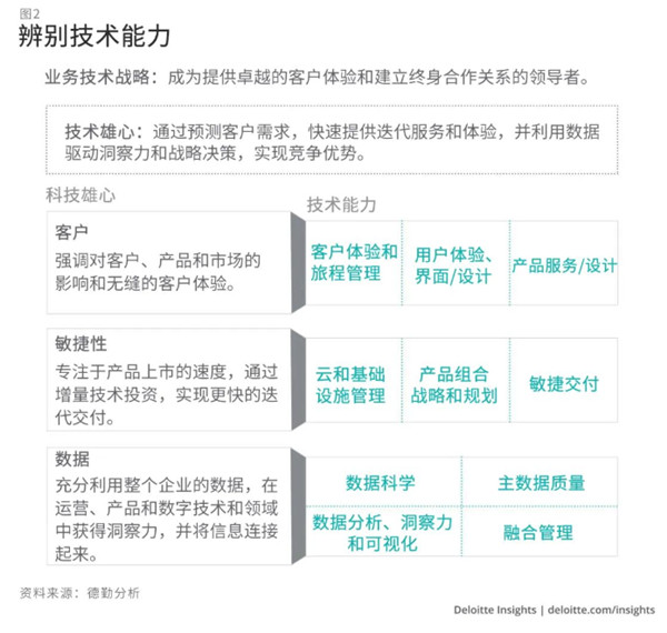 一個組織的技術(shù)目標(biāo)在于它如何選擇使用這六種杠桿來實(shí)現(xiàn)價(jià)值。由于每一個能力都有其獨(dú)特的重要性,導(dǎo)致了一些領(lǐng)導(dǎo)者會同時追求所有的能力。然而,我們建議將工作重點(diǎn)放在兩三個領(lǐng)域,在這些領(lǐng)域中,技術(shù)可以幫助企業(yè)提供關(guān)鍵的競爭優(yōu)勢,幫助企業(yè)實(shí)現(xiàn)價(jià)值最大化。確定最能支持組織戰(zhàn)略和目標(biāo)的能力是哪些,可能是一個復(fù)雜而富有挑戰(zhàn)性的過程。第一步是盤點(diǎn)組織的現(xiàn)有能力,并評估本公司目前在這些能力方面發(fā)展得是否成熟。下一步是找出對戰(zhàn)略和技術(shù)目標(biāo)都至關(guān)重要的能力——并非所有能力都是平等的。Pareto原則是適用的(即80%的技術(shù)所產(chǎn)生的價(jià)值是通過20%的能力來實(shí)現(xiàn)的)。你要尋找那些對實(shí)現(xiàn)技術(shù)目標(biāo)幫助巨大的能力。這些能力中,有些能力可能已經(jīng)很成熟了,有些可能是新興的,有些可能根本就不存在。在分析過程中收集到的信息可以幫助CIO們決定是否自己需要建立、購買、升級或暫時從服務(wù)提供商或合作伙伴那里獲得這些能力。舉一個假設(shè)性的例子,一家大型零售企業(yè)致力于成為“提供卓越的客戶體驗(yàn)和建立終身合作關(guān)系的領(lǐng)導(dǎo)者”,多種技術(shù)野心都能使這一戰(zhàn)略獲得成功。最終,零售商決定將重點(diǎn)放在客戶、敏捷性和數(shù)據(jù)上,以“通過預(yù)測客戶需求、快速提供迭代服務(wù)和體驗(yàn),并利用數(shù)據(jù)驅(qū)動洞察力和戰(zhàn)略決策,實(shí)現(xiàn)競爭優(yōu)勢”。然后,零售商評估當(dāng)前的技術(shù)能力,確定未來的需求,找出兩者之間的差距,并確定能夠培養(yǎng)這種技術(shù)目標(biāo)的技術(shù)能力(圖2)。在過去,許多CIO們試圖堅(jiān)持單一的技術(shù)運(yùn)營模式。如今,沒有任何一種“一刀切”的運(yùn)營模式可以應(yīng)對動態(tài)組織的挑戰(zhàn)。領(lǐng)導(dǎo)者不必拘泥于單一的運(yùn)營模式,也不能滿足于二元化的運(yùn)營模式,快速變化的環(huán)境要求運(yùn)營模式必須更加靈活和不斷發(fā)展。了解可以運(yùn)用的運(yùn)營模式,可以幫助技術(shù)領(lǐng)導(dǎo)者確定每種能力的最佳運(yùn)用方式。在充分理解了戰(zhàn)略、技術(shù)目標(biāo)和能力之后,他們可以通過將最有效的運(yùn)營模式與對應(yīng)的能力相匹配,尤其是匹配那些支持戰(zhàn)略和目標(biāo)的運(yùn)營模式后,去開始嘗試多種運(yùn)營模式。混合模式:平衡新技術(shù)和現(xiàn)有技術(shù)。目的是減少對現(xiàn)有技術(shù)和基于領(lǐng)域的傳統(tǒng)模式的依賴。企業(yè)可能會涉足云服務(wù),使用敏捷方法和工具,最終更廣泛地采用數(shù)字化和云平臺。技術(shù)人員不再僅僅被看作是服務(wù)的提供者,而是業(yè)務(wù)的推動者或值得信賴的業(yè)務(wù)顧問。以產(chǎn)品為中心的模式:與業(yè)務(wù)伙伴共同創(chuàng)造。“即建即用”的產(chǎn)品功能由IT和業(yè)務(wù)人才共同組成的產(chǎn)品團(tuán)隊(duì)來交付,他們關(guān)注的是業(yè)務(wù)成果,雙方的緊密結(jié)合也有助于減少部門孤島。無邊界模式:連續(xù)集成和交付。由具有必要技能的業(yè)務(wù)和技術(shù)人才組成的專門小組來專注于創(chuàng)造、提升和交付價(jià)值;他們利用自動化的優(yōu)勢,持續(xù)地、集成式地交付產(chǎn)品更新。不過,無邊界模式不適合傳統(tǒng)上由技術(shù)職能部門支持的產(chǎn)品和服務(wù),如協(xié)作工具和ERP系統(tǒng),可能仍需要由核心的中央技術(shù)職能部門管理和交付。它更適合于由技術(shù)職能團(tuán)隊(duì)創(chuàng)造價(jià)值、推動實(shí)驗(yàn)和創(chuàng)新的情況,或適用于把產(chǎn)品上市時間作為關(guān)鍵目標(biāo)的情況。