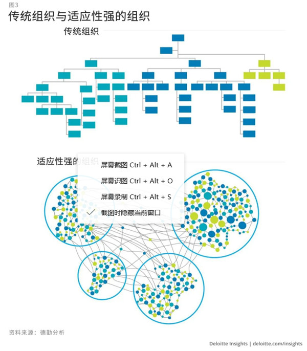 組織轉(zhuǎn)型為了充分利用新的技術(shù)運(yùn)營模式,組織應(yīng)在多個層面進(jìn)行轉(zhuǎn)型。這包括重新設(shè)計(jì)組織結(jié)構(gòu),擁抱廣泛使用的勞動力生態(tài)系統(tǒng),以及重新思考企業(yè)文化。適應(yīng)性強(qiáng)的組織設(shè)計(jì)。要優(yōu)先考慮人的因素,包括人與人之間的合作方式、非正式的關(guān)系和網(wǎng)絡(luò),以及客戶的投入和反饋。這些組織的設(shè)計(jì)是為了承認(rèn)和利用正式系統(tǒng)以及非正式網(wǎng)絡(luò)——也就是那些通常比正式系統(tǒng)對行為和結(jié)果有更大影響力的聯(lián)系和交流(圖3)。雖然有些企業(yè)將組織設(shè)計(jì)作為運(yùn)營模式再設(shè)計(jì)過程中的第一步,但我們建議將其作為整個過程的最后一步。我們應(yīng)該鼓勵虛擬的、流動的、協(xié)作的團(tuán)隊(duì)結(jié)構(gòu),而不是靜態(tài)的、固定的團(tuán)隊(duì)關(guān)系。人力資源生態(tài)系統(tǒng):延伸到外包之外。不斷發(fā)展的技術(shù)能力、交付模式的轉(zhuǎn)變以及人力資源生態(tài)系統(tǒng)的出現(xiàn),正在幫助重新定義技術(shù)所扮演的角色。這將要求企業(yè)做出決定,是在內(nèi)部培養(yǎng)人員技能,還是通過更廣泛的人力資源生態(tài)系統(tǒng)來獲取這一能力。軟技能是持久的,基本上是機(jī)器無法復(fù)制的人類技能,也是對技術(shù)專長的補(bǔ)充。隨著機(jī)器技能和人類軟技能在創(chuàng)造價(jià)值過程中變得平等重要,技術(shù)組織同樣也變得更加依賴關(guān)鍵的人類技能,包括創(chuàng)造力、認(rèn)知靈活性和情商。很多技術(shù)領(lǐng)導(dǎo)者會認(rèn)為,這三種軟技能將在未來三年內(nèi)成為最重要的軟技能。企業(yè)文化:適應(yīng)新常態(tài)。僵化的文化、自滿和缺乏靈活性是企業(yè)獲得數(shù)字化增長的最大威脅。德勤2018年全球CIO調(diào)查發(fā)現(xiàn),企業(yè)文化,也就是組織的行為和信念,是企業(yè)和比自己更先進(jìn)的同行之間最大的區(qū)別。領(lǐng)先企業(yè)在招聘和雇傭技術(shù)人才時,主要依靠其組織文化。傳統(tǒng)的技術(shù)文化很可能需要經(jīng)歷一場有意識的、巨大的轉(zhuǎn)變。為了鼓勵創(chuàng)新和協(xié)作,以及幫助獲取和留住頂尖的技術(shù)人才,組織文化應(yīng)該能適應(yīng)變化、給予支持和吸引大家的參與度。