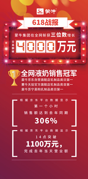 618全民年中購物節(jié)當天,蒙牛液奶銷售全網奪冠,斬獲三位數(shù)增長,獲得蒙牛京東自營旗艦店、天貓蒙牛官方旗艦店、蘇寧蒙牛官方旗艦店乳制品類目第一的佳績。