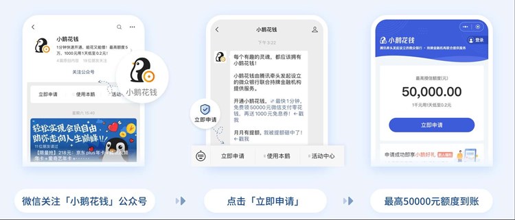 (1)小鵝花錢:目前小鵝花錢面向全量用戶開放申請,用戶可以微信關注【小鵝花錢】公眾號—點擊【立即申請】即可獲得最高50000額度的微信支付零花錢。