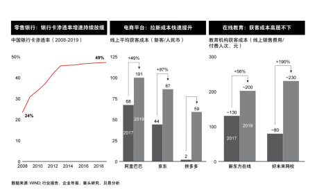 從銀行卡滲透率增速、電商平臺(tái)獲客成本、在線教育獲客成本行業(yè)數(shù)據(jù)來看,經(jīng)濟(jì)快速擴(kuò)張的增量時(shí)代已經(jīng)過去,市場競爭正在進(jìn)入存量時(shí)代。利用智慧服務(wù)營銷提升企業(yè)服務(wù)效率,正在成為行業(yè)增長新方向。