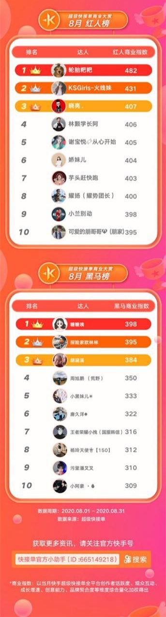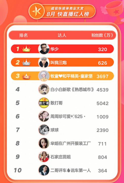近日,快手發(fā)布了8月“超級快接單商業(yè)大賞”榜單。除了“MCN榜”、“紅人榜”和“黑馬榜”外,本次榜單新增快視頻和快直播榜單,更精準(zhǔn)地呈現(xiàn)各營銷場景下達(dá)人和機(jī)構(gòu)的商業(yè)價值,為廣告主決策提供有力依據(jù)。其中,在快直播紅人榜單中,憑借專業(yè)的主持能力及出色的口才,華少名列第一。