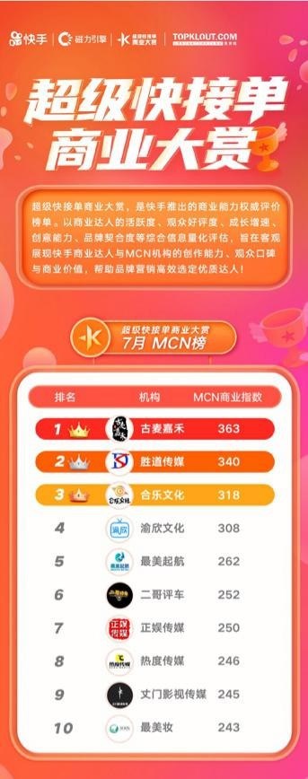 據(jù)了解,超級快接單商業(yè)大賞,是快手推出的商業(yè)能力權(quán)威評價榜單。在評選過程中,快手主要從商業(yè)達(dá)人的活躍度、觀眾好評度、成長增速、創(chuàng)意能力、品牌契合度和等綜合信息進(jìn)行量化評估,旨在客觀展現(xiàn)快手商業(yè)達(dá)人與MCN機(jī)構(gòu)的創(chuàng)作能力、品牌口碑與商業(yè)價值,幫助品牌營銷高效選定優(yōu)質(zhì)達(dá)人。