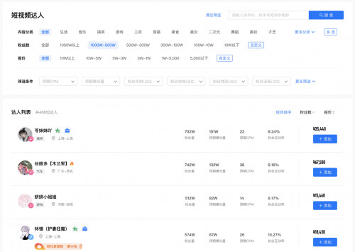 基于多元和智能的大數(shù)據(jù),在達(dá)人篩選上,快接單對(duì)達(dá)人廣場(chǎng)進(jìn)行全面改版、對(duì)達(dá)人主頁(yè)進(jìn)行升級(jí)迭代,幫助廣告主高效匹配達(dá)人,助力投放效果最大化與營(yíng)銷(xiāo)效果最優(yōu)化。新版達(dá)人廣場(chǎng)包含視頻達(dá)人廣場(chǎng)與直播達(dá)人廣場(chǎng),在粉絲量、內(nèi)容類(lèi)型與報(bào)價(jià)等基礎(chǔ)篩選維度之外,新增多種達(dá)人篩選的維度。新增達(dá)人列表基礎(chǔ)數(shù)據(jù)與“已選達(dá)人”功能,廣告主在選擇達(dá)人后,可在選擇列表內(nèi)長(zhǎng)期保留,并對(duì)意向達(dá)人進(jìn)行數(shù)據(jù)對(duì)比和優(yōu)選。同時(shí),新版達(dá)人主頁(yè)將視頻主頁(yè)與直播主頁(yè)拆開(kāi),最大程度開(kāi)放達(dá)人視頻及直播數(shù)據(jù),新增更多達(dá)人基礎(chǔ)信息,是否對(duì)公結(jié)算、是否為機(jī)構(gòu)下達(dá)人等信息一目了然。