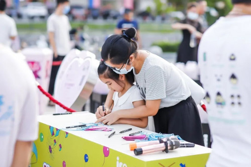 在現(xiàn)場(chǎng),不少家長帶著小朋友寫下了祝福和愿望,小朋友們將一個(gè)個(gè)帶著純真祝福和愿望的水瓶放入“Feng巢”中,“光愛2020”被逐漸點(diǎn)亮。