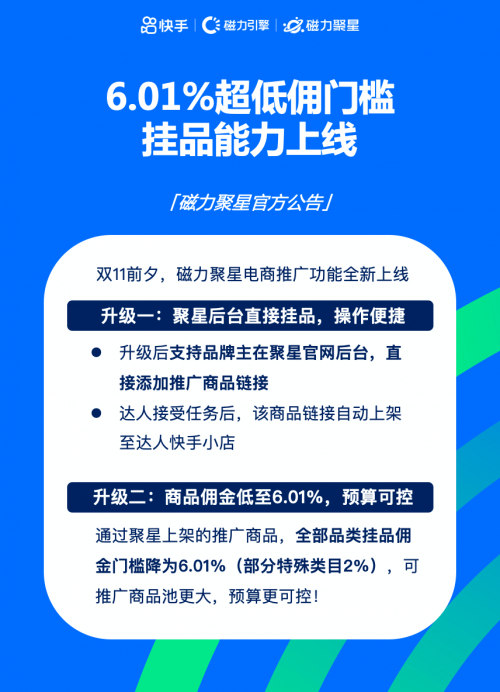 雙十一在即,為持續(xù)賦能品牌和達(dá)人,快手磁力聚星對(duì)“掛品能力”進(jìn)行優(yōu)化升級(jí)。升級(jí)后,客戶可直接在磁力聚星后臺(tái)上傳商品鏈接,達(dá)人認(rèn)領(lǐng)任務(wù)后,該鏈接自動(dòng)上架至達(dá)人快手小店,極大縮短客戶與達(dá)人溝通鏈路,提高投放效率。同時(shí),通過磁力聚星上架的推廣產(chǎn)品,全部品類商品傭金門檻低至6.01%,部分特殊品類傭金門檻更低至2%。