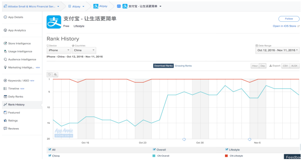 根據(jù)App Annie,螞蟻花唄作為阿里巴巴的金融信用服務(wù),由于為在今年 “雙十一”購(gòu)物的阿里巴巴消費(fèi)者提供額外的信用額度而備受關(guān)注。活動(dòng)從 10 月 18 日開(kāi)始,截止到 11 月 12 日,螞蟻花唄共送出了 100 億元人民幣的信用額度。由于該信用服務(wù)主要通過(guò)支付寶提供,因此在 “雙十一”前夕,iOS 的 “螞蟻花唄”下載量激增。
