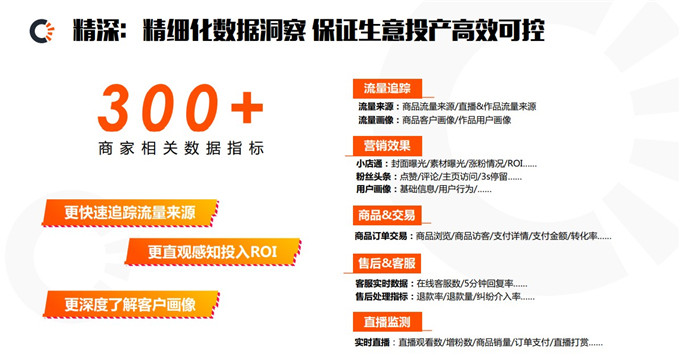 在數(shù)據(jù)深度方面,快手生意通可以為商家提供300+相關(guān)數(shù)據(jù)指標(biāo),點(diǎn)到點(diǎn)精準(zhǔn)觸達(dá)商家核心需求,幫助商家更快速追蹤流量來(lái)源,直觀感知ROI,深度了解客戶畫像。