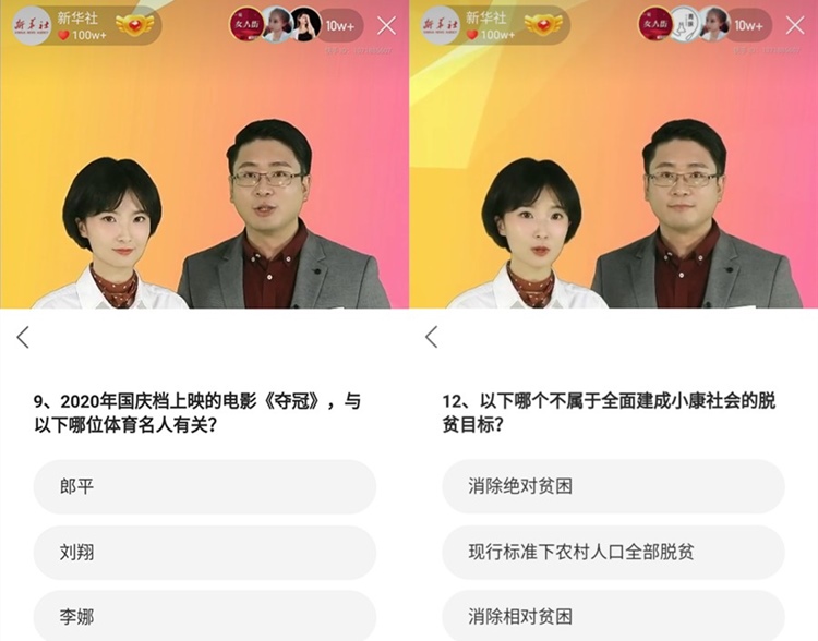 通過“接種新冠疫苗正確的做法是?”“我國自主研發(fā)的導(dǎo)航衛(wèi)星系統(tǒng)叫做?”“電影《花木蘭》,故事原型出自我國哪個朝代?”“2020年國慶檔上映的電影《奪冠》,與以下哪位體育名人有關(guān)?”“2035年的遠景目標中提到,哪個收入群體顯著擴大?”等題目內(nèi)容,以及主持人在公布答案后結(jié)合五中全會公報進行的深入解讀,快速幫助大眾深入學(xué)習(xí)領(lǐng)會五中全會精神,以及全會提出的一系列新的重要思想、重要論斷、重大舉措。