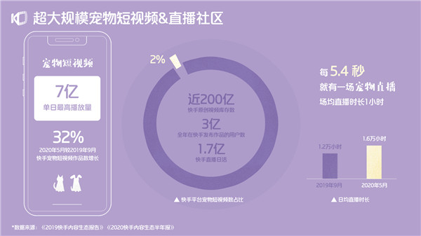 根據(jù)快手大數(shù)據(jù)研究院發(fā)布《2020快手寵物生態(tài)報(bào)告》,截止到2020年5月,快手活躍寵物作者已經(jīng)達(dá)到了7.5萬,快手寵物觀眾超過1億,快手寵物短視頻單日最高播放量達(dá)7億,每5.4秒就有一場寵物直播。目前,快手圍繞寵物食品、寵物醫(yī)療、寵物電商等打造了快手寵物生態(tài),為品牌方、寵物達(dá)人及消費(fèi)者帶來豐富多樣的內(nèi)容及產(chǎn)品,形成了快手寵物服務(wù)生態(tài)圈。