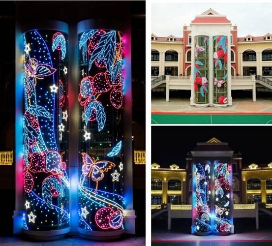 而在“I ? 從化”創(chuàng)意燈光裝置不遠(yuǎn)處觀光梯上,夜空彩虹設(shè)計(jì)團(tuán)隊(duì)根據(jù)從化特產(chǎn)荔枝,設(shè)計(jì)了一組由蝴蝶和荔枝構(gòu)成的唯美且寓意美好的“富利圖”燈飾畫。