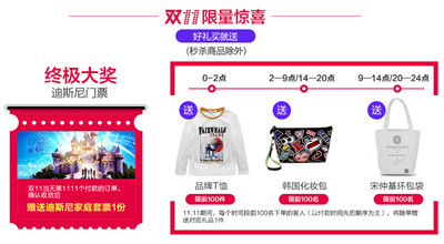 除此以外馬克華菲女裝和童裝集體放送壕禮,驚喜不停,買二送一,更有定制韓版化妝包,宋仲基環(huán)保袋限量等你來拿!20:00以后每兩小時秒殺一共8款商品。童裝買四免一,還有瘋狂秒殺以及迪斯尼門票大獎,限時搶購!