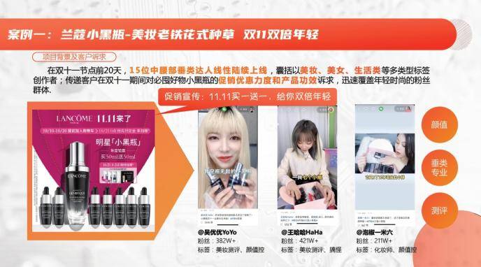 雙十一期間,蘭蔻即通過與快手磁力聚星旗下15位中腰部垂類達(dá)人合作,以線性陸續(xù)上線營(yíng)銷內(nèi)容玩法,成功對(duì)老鐵進(jìn)行花式種草,迅速覆蓋年輕時(shí)尚的粉絲群體。