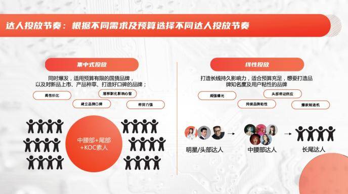 首先,從達(dá)人組合投放策略來看,對(duì)于有充足預(yù)算的超頭部大品牌,更適合“達(dá)人層層滲透”整合策略,即全面覆蓋超頭部KOL到頭腰尾部KOL再到KOC,依托投放矩陣實(shí)現(xiàn)多元營(yíng)銷目標(biāo)。