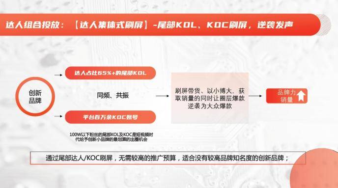 而對(duì)于沒有較高品牌知名度的創(chuàng)新品牌,則更適合“腰尾部達(dá)人集體式刷屏”策略,通過尾部KOL、KOC刷屏,在獲取銷量的同時(shí)讓圈層爆款逆襲為大眾爆款,實(shí)現(xiàn)品牌力和銷量雙重引爆。