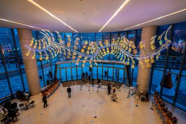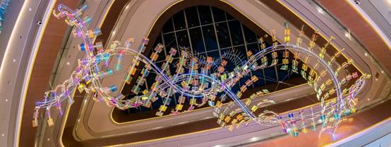 “奔流”,兩道流線型鋼結(jié)構(gòu)龍骨蜿蜒交錯(cuò),配合延伸而出的幻彩亮片打造視覺(jué)主體,形成連綿潮汐奔流不止的自然景象。