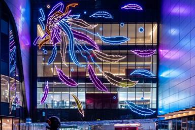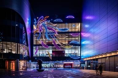 商場(chǎng)連廊立面巨幅燈飾畫(huà)“羽禮相遇”,由五彩斑斕的羽毛從禮盒中迸發(fā)飄散。